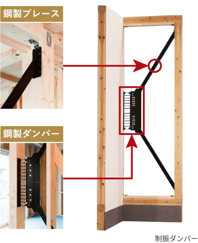国土交通大臣認定で最大値となる壁倍率5倍を取得した、制振ダンパーを標準装備。内蔵された鋼製ダンパーが変形することで地震エネルギーを吸収し、建物の揺れを大幅に軽減するとともに、建物の変形を低減するので、建物の長寿命化を実現。また、鋼製ダンパーにより、長期にわたって性能が安定し、経年劣化が少なくなります。